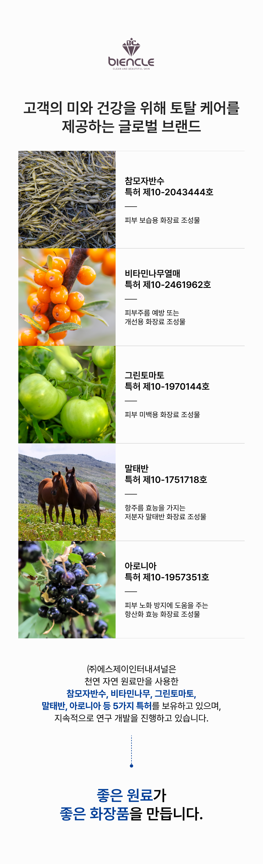 정제수(water) No 참모자반 추출수(Sargassum Fulvellum Extract) 사용 미백&주름개선 이중 기능성 화장품 보습 특허 제 10-2043444호 미백 특허 제 10-1970144호 피부 보습에 효과적인 독자적 특허 원료 참모자반수(Sargassum Fulvellum Extract) 베이스에 피부를 화사하게 만들어주는 특허 성분을 함유하여 피부에 활력을 심어 드립니다. 문제성 피부를 위한 편백수(Chamaecyparis Obtusa Water) ,레드호그위드뿌리 (Boerhavia Diffusa Extract) ,병풀(Centella Asiatica Extract)마치현(Portulaca Oleracea Extract) 성분등 을 함유하여 자신감 있고 생기있는 피부를 완성해 드립니다.