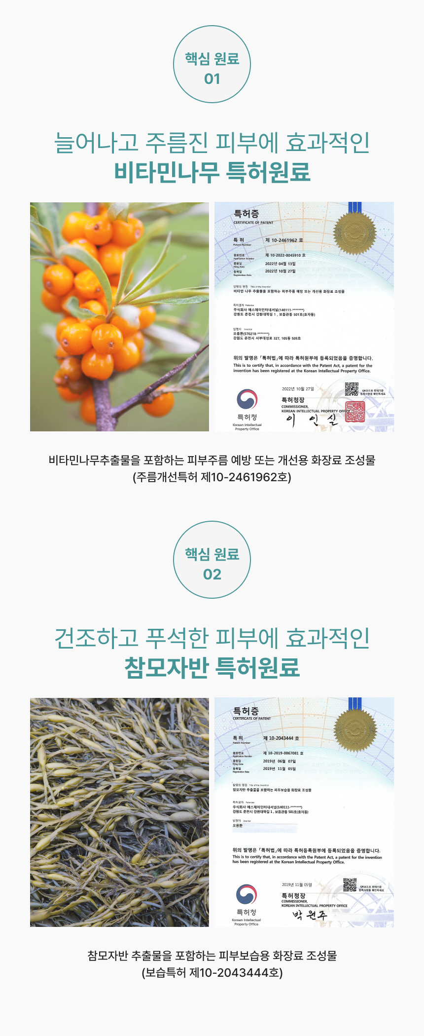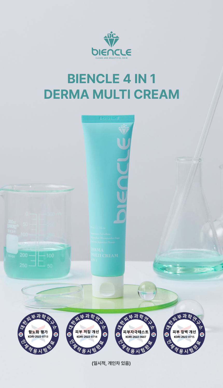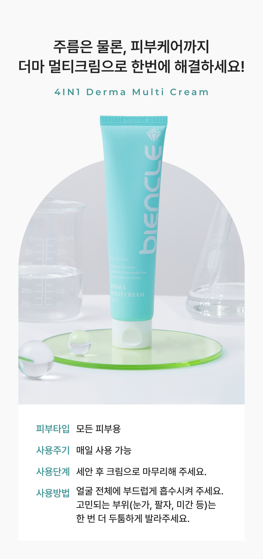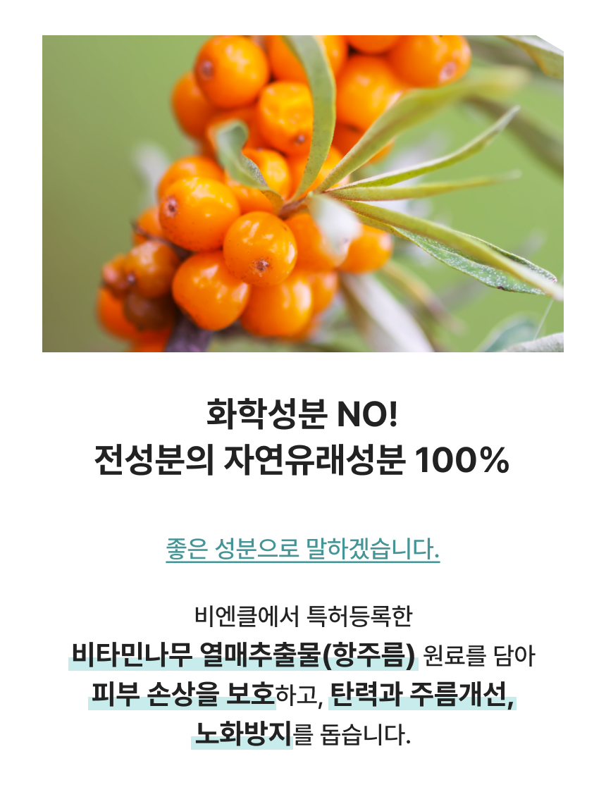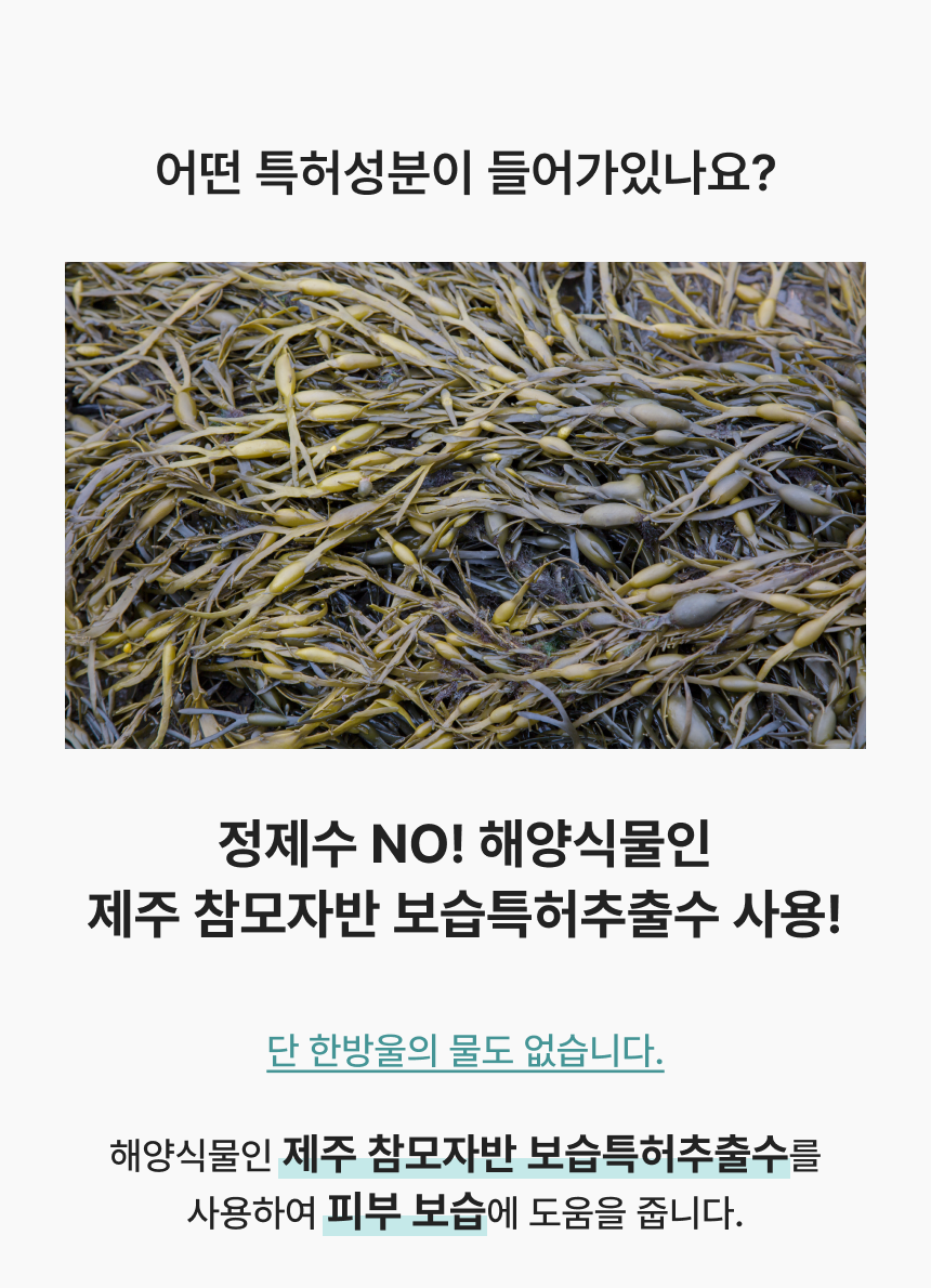 독자적인 특허 원료인 피부 보습에 효과적인 정제수 대신 사용한 참모자반수와 피부주름 예방과 개선을 위한 비타민나무열매추출물 원료를 담은 스킨, 에센스, 세럼, 크림을 하나로 한 4IN1 크림입니다. 눈가주름, 피부보습, 피부탄력, 피부톤 및 피부 치밀도 개선에 도움을 줍니다.