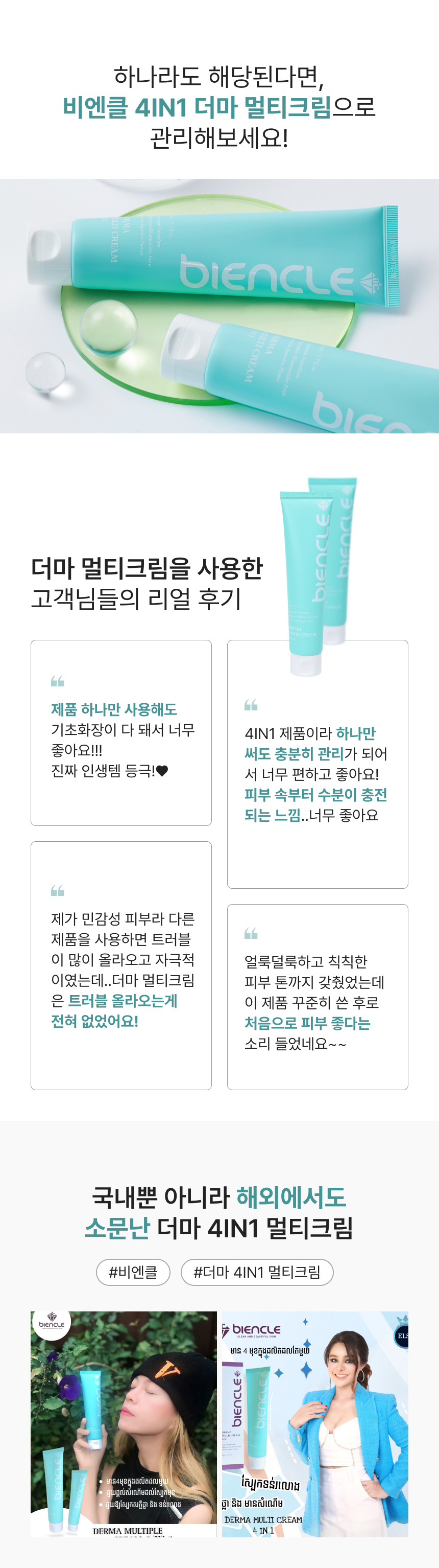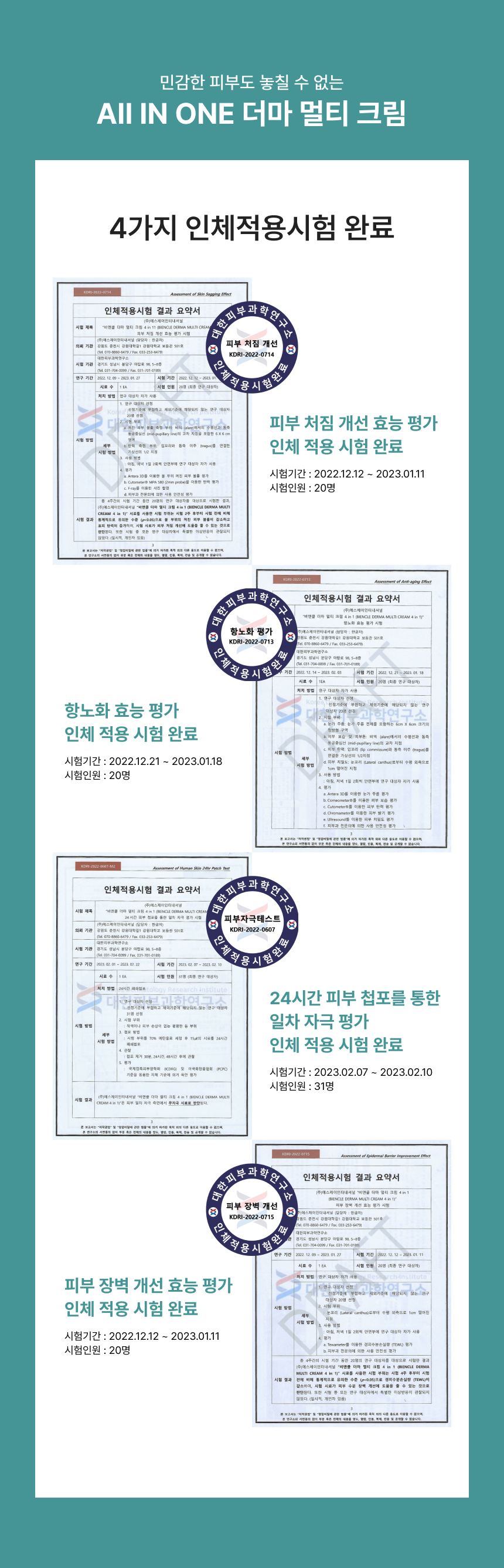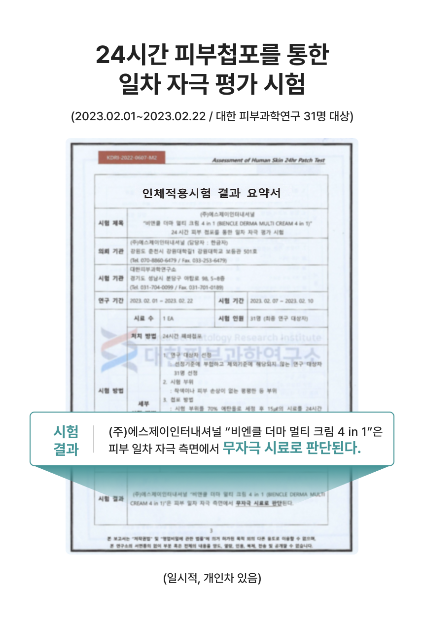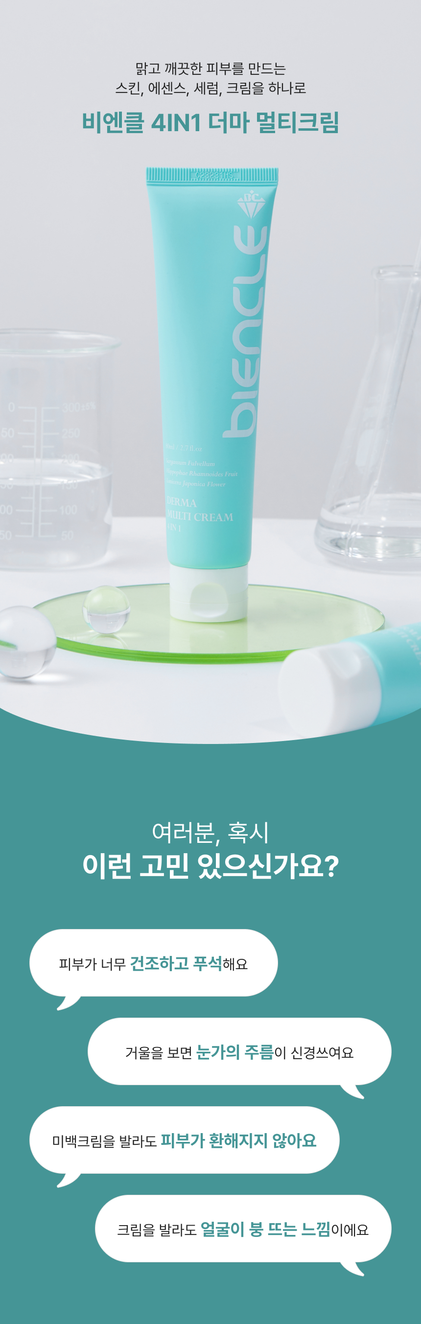 독자적인 특허 원료인 피부 보습에 효과적인 정제수 대신 사용한 참모자반수와 피부주름 예방과 개선을 위한 비타민나무열매추출물 원료를 담은 스킨, 에센스, 세럼, 크림을 하나로 한 4IN1 크림입니다. 눈가주름, 피부보습, 피부탄력, 피부톤 및 피부 치밀도 개선에 도움을 줍니다.