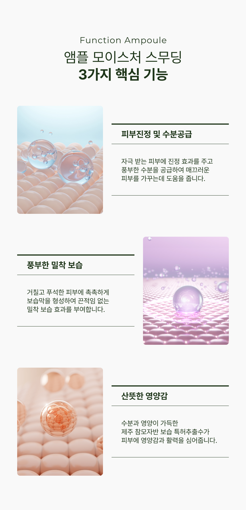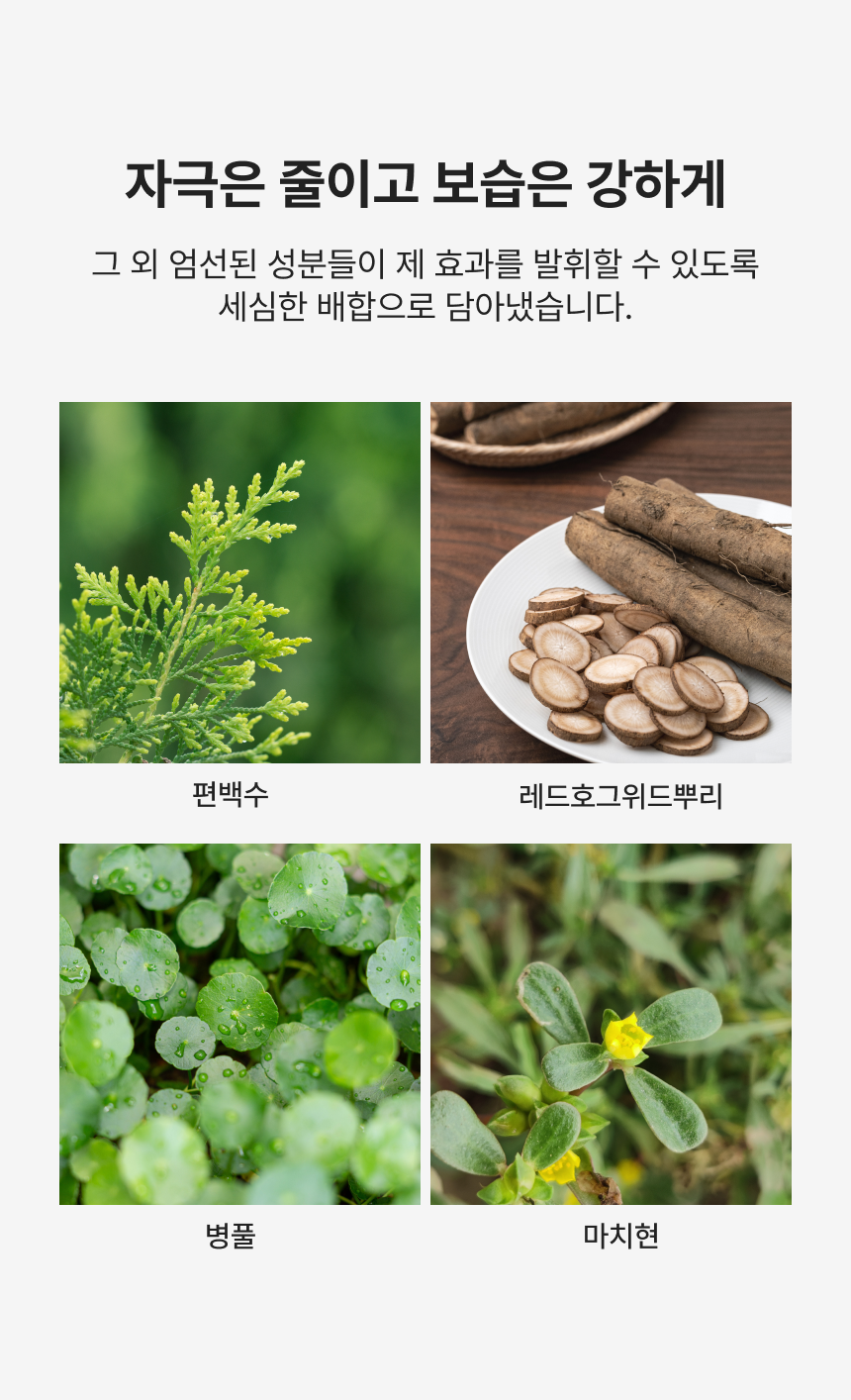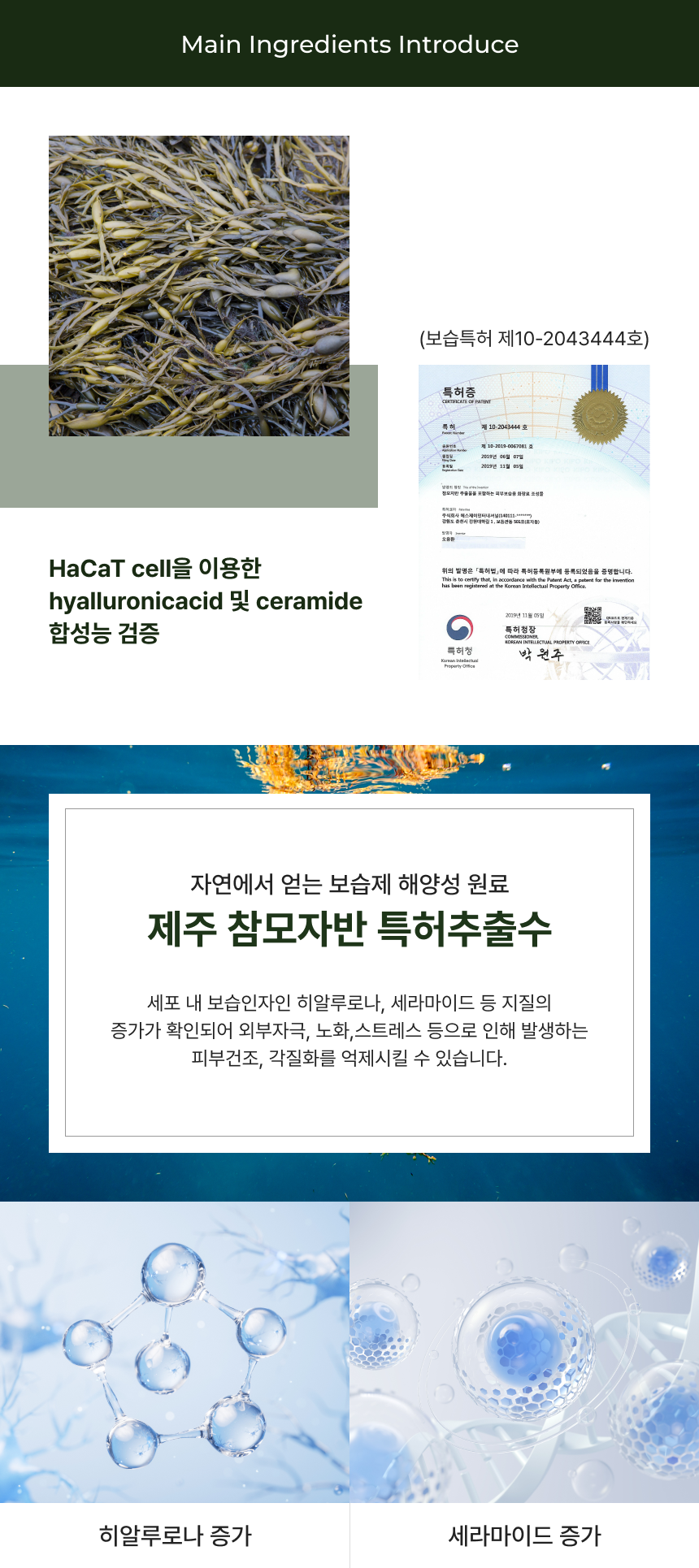 피부 보습에 효과적인 독자적 특허 원료 참모자반수와 피부를 화사하게 만들어주는 특허 성분을 함유하여 피부에 활력을 심어 드리며, 문제성 피부를 위한 성분을 함유하여 자신감 있고 생기 있는 피부를 완성해드립니다.